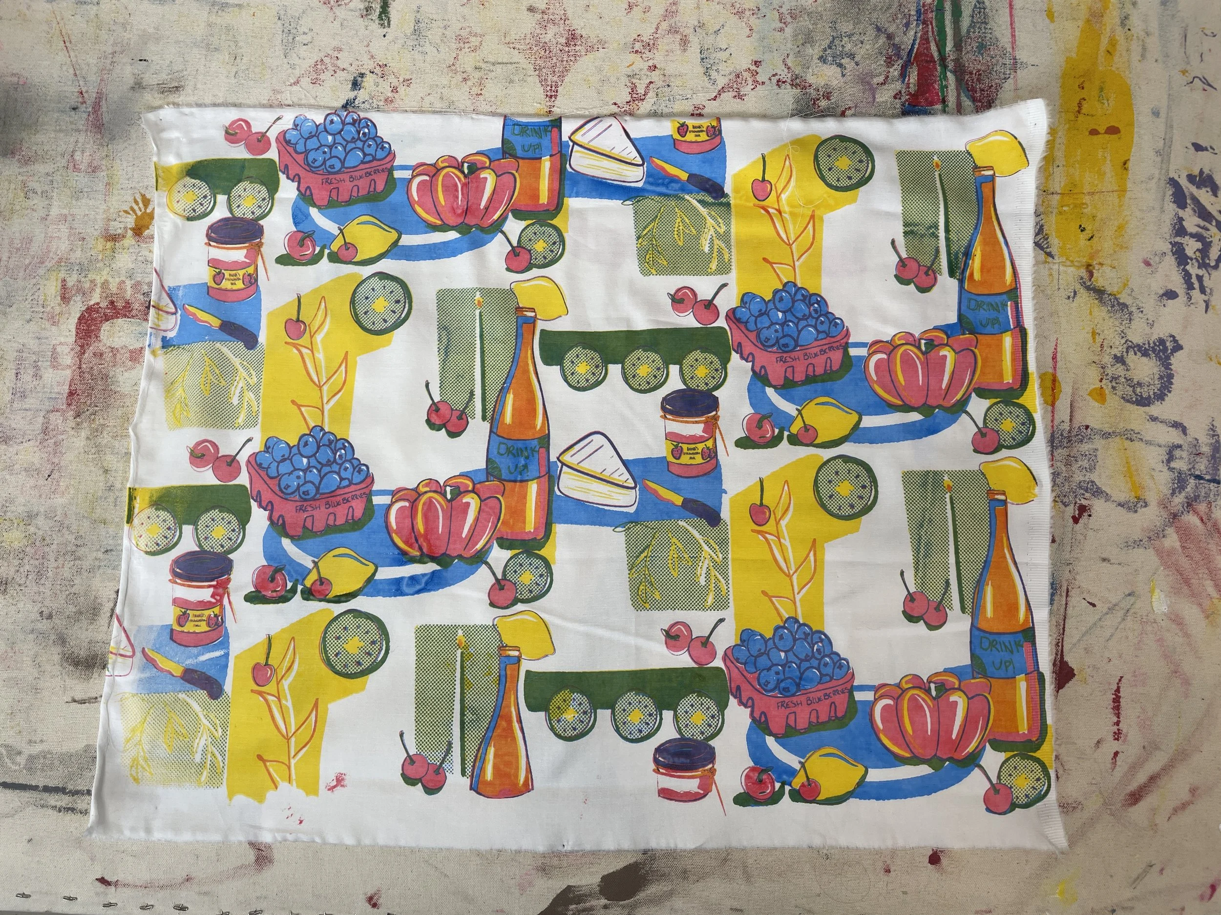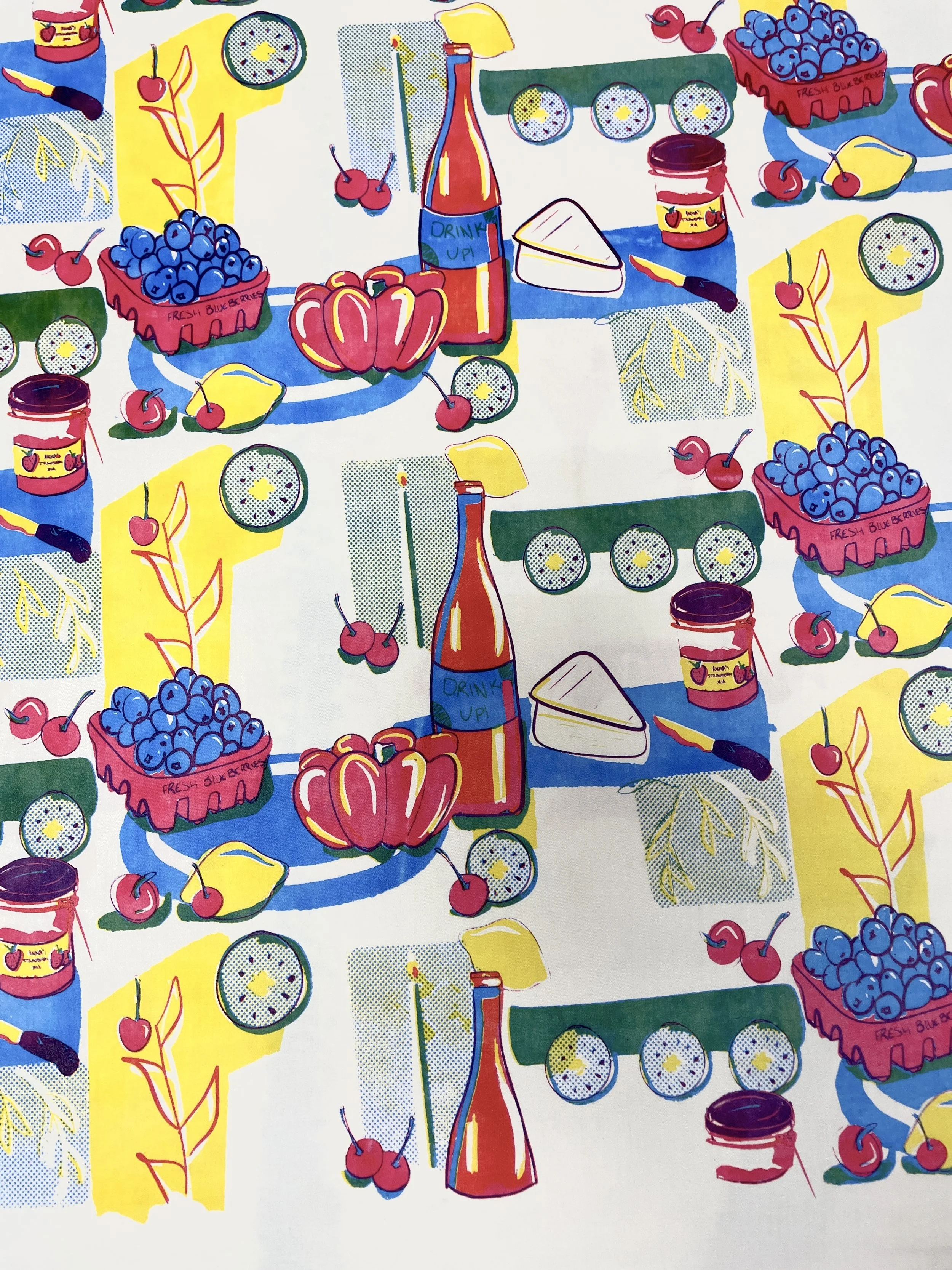 A European summer inspired print of a painted still life picnic. Screen printed on a luxurious 4 yards of cotton sateen, this fabric could be turned into any experience from brunch at the golf course in a summer dress, mixing an aperol spritz in an apron, setting up a dinner party with placemats, and more.
