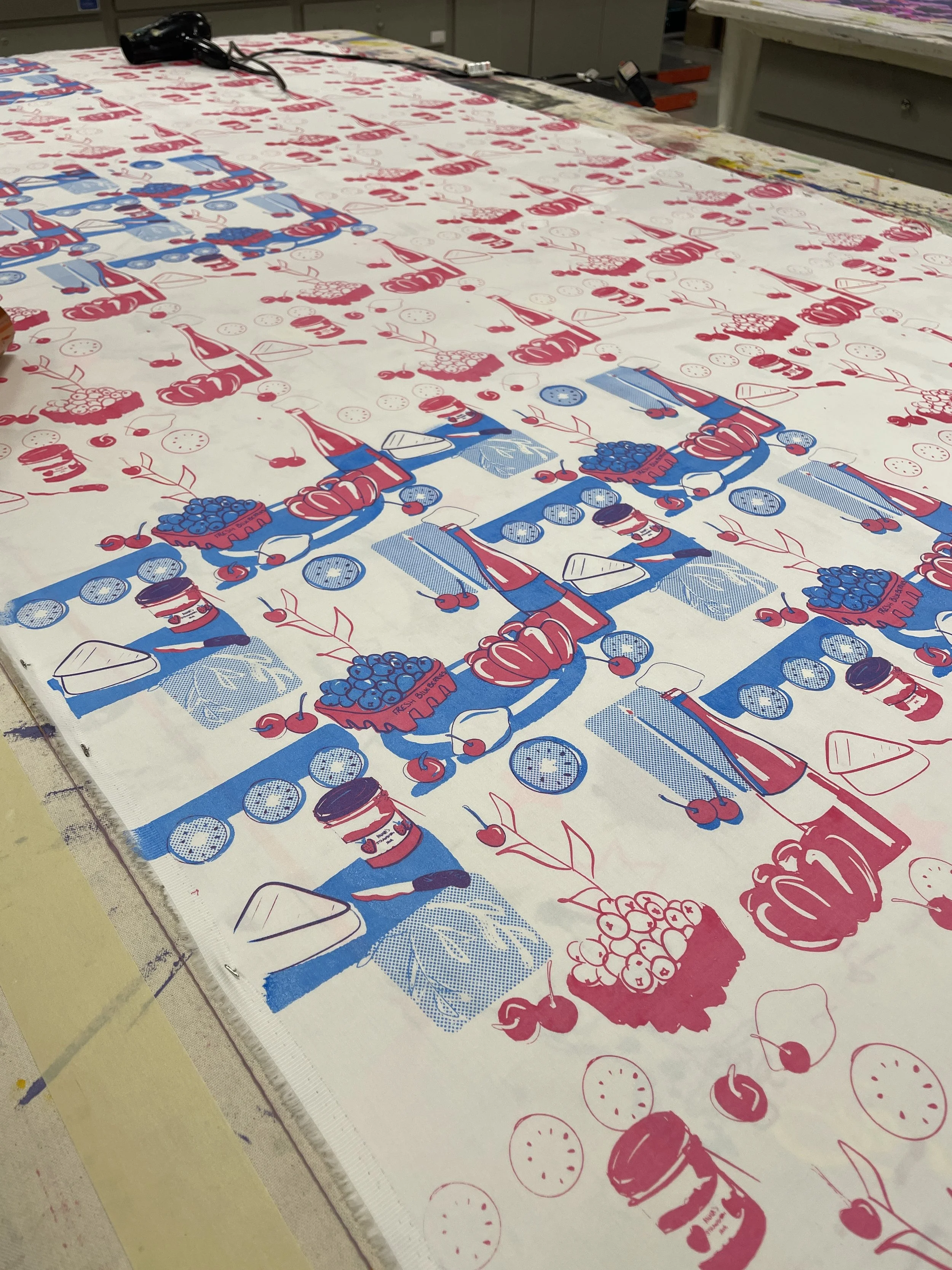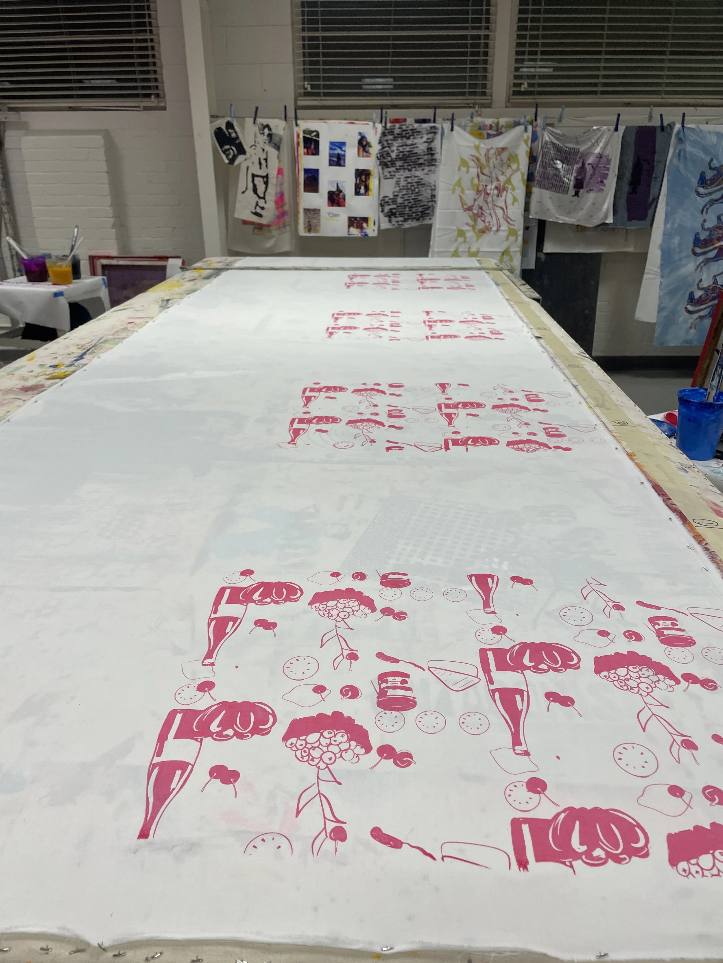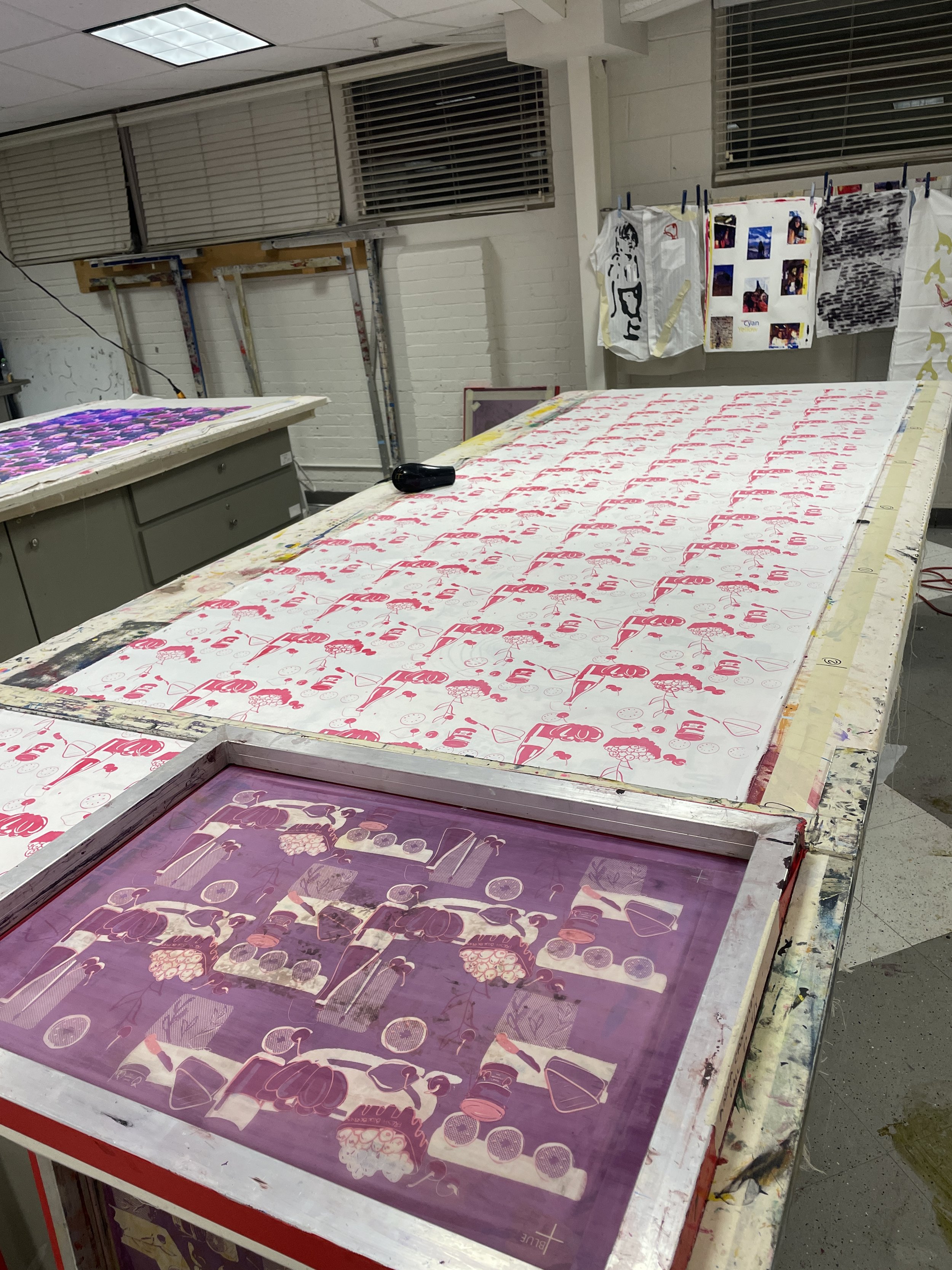 Starting the process after measuring with the pink printing every other space, drying, then going back between the spaces. Making sure to use even consistent pulls throughout.