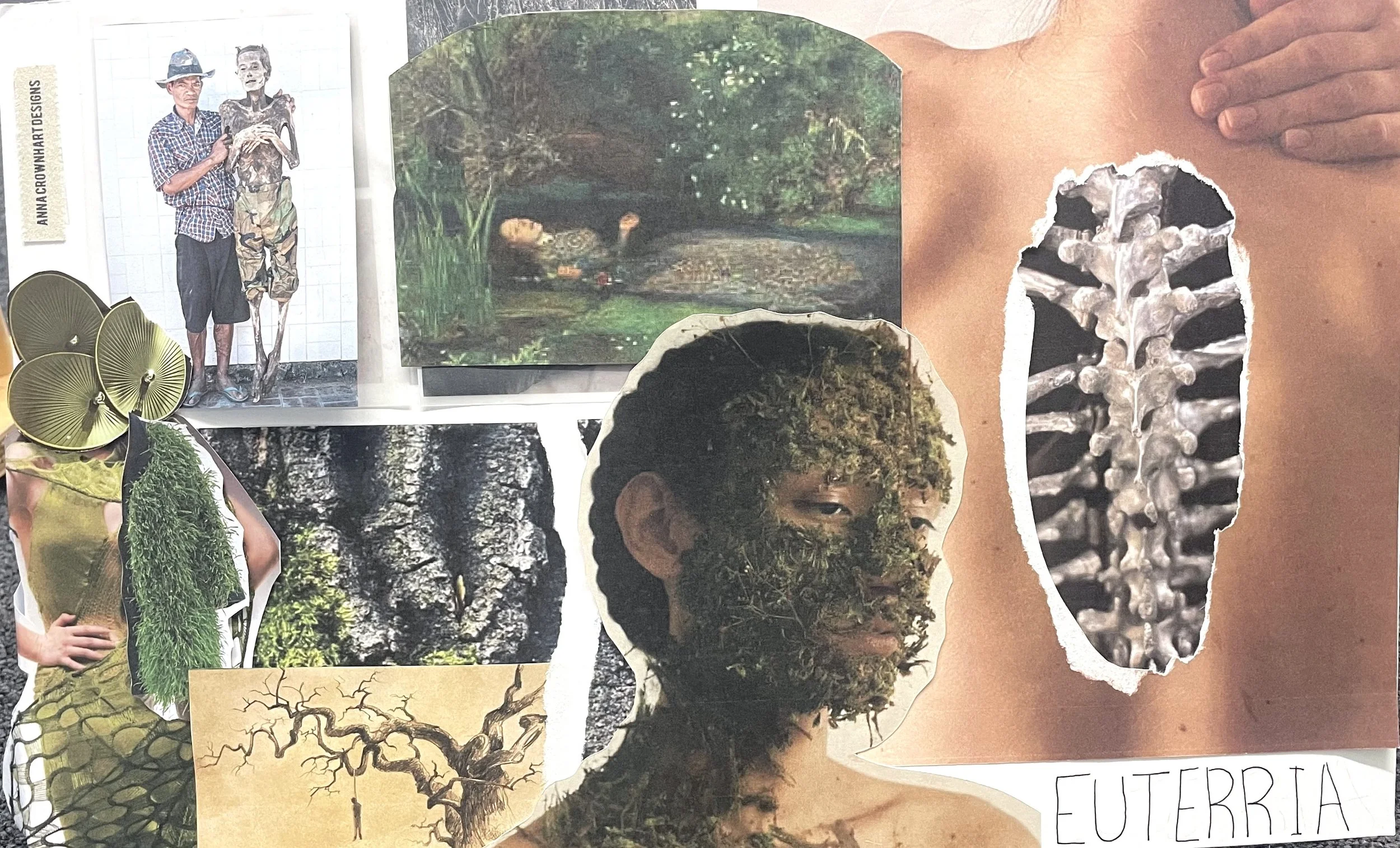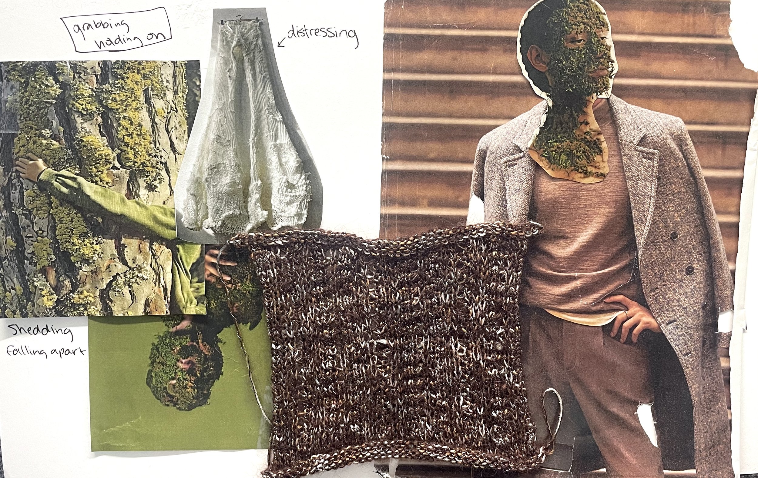 Eutierria means “oneness with Earth” where the boundaries of self and nature are blurred. Becoming part of nature can be beautiful as we completely immerse ourselves with every texture and detail. This knit collection uses cottons with wools to add more texture and create a mossy like effect which is one of the aspects in nature that I chose to focus on. Using rehung stitches I chose to mimics bark and the raised elements found outdoors. I loves this texture and chose to create an off the shoulder sweater with this rehung stitch technique incorporating mohair for a slight fuzzy texture poking out.