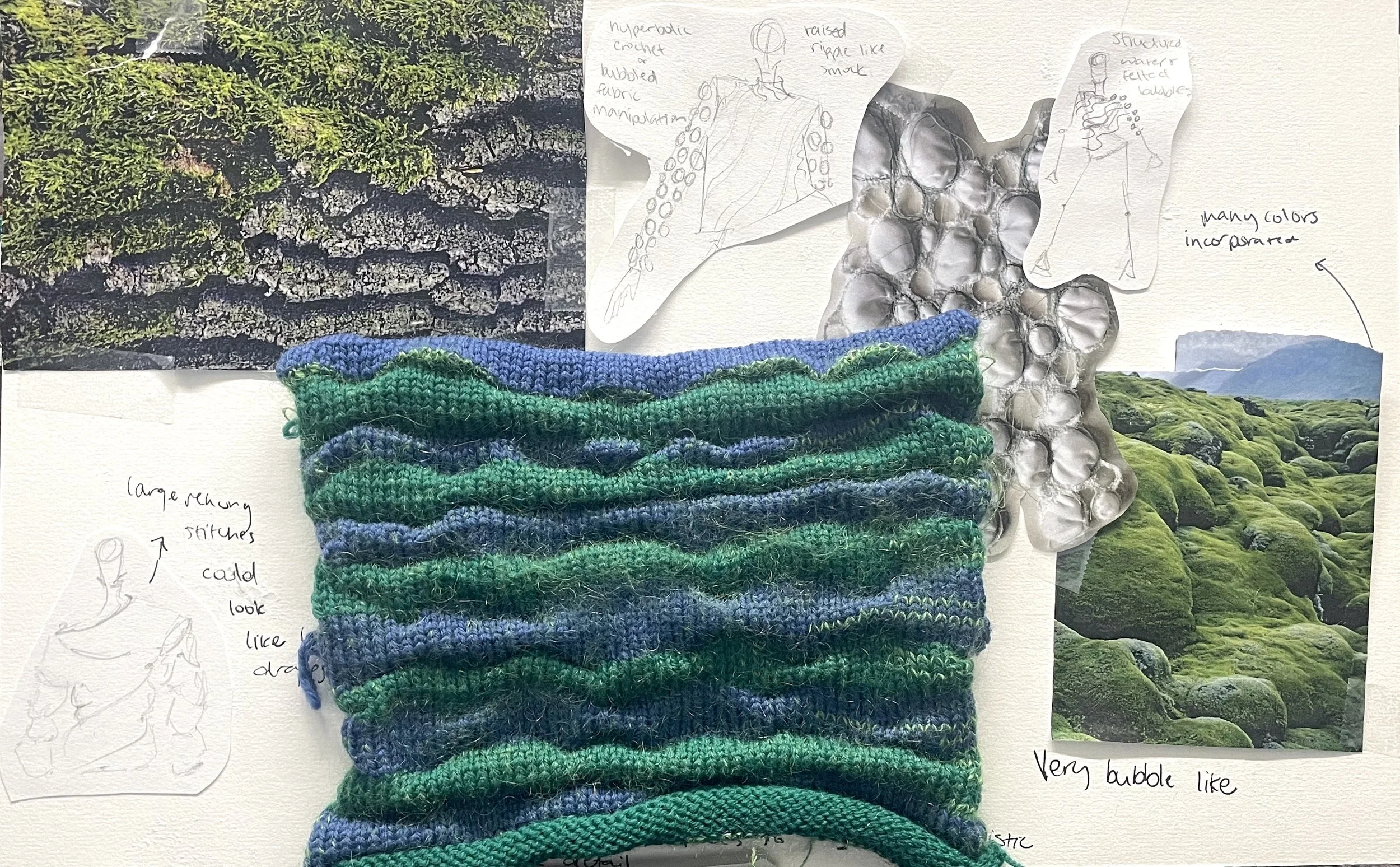 Process 1 with rehung stitch inspired by bark and these rocks covered with moss